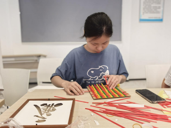 竹编技艺作为国家级非物质文化遗产,凝结着中华文明的工匠精神与智慧结晶。活动第二篇章创新廉洁文化载体,将活动与中华优秀传统文化传承相结合,进行非遗竹编的学习。大家分别编织“南湖红船”“清”“廉”“清廉自律”等主题作品。通过沉浸式体验非遗竹编技艺,引导党员在编织过程中感悟“守规矩、讲细节”的深刻内涵。党员黄韵琪完成编织后表示:“本次主题党日活动让我深刻体会到,在以后的学习生活中要严于律己,关注细节,在生活学习的点点滴滴践行廉洁教育。”