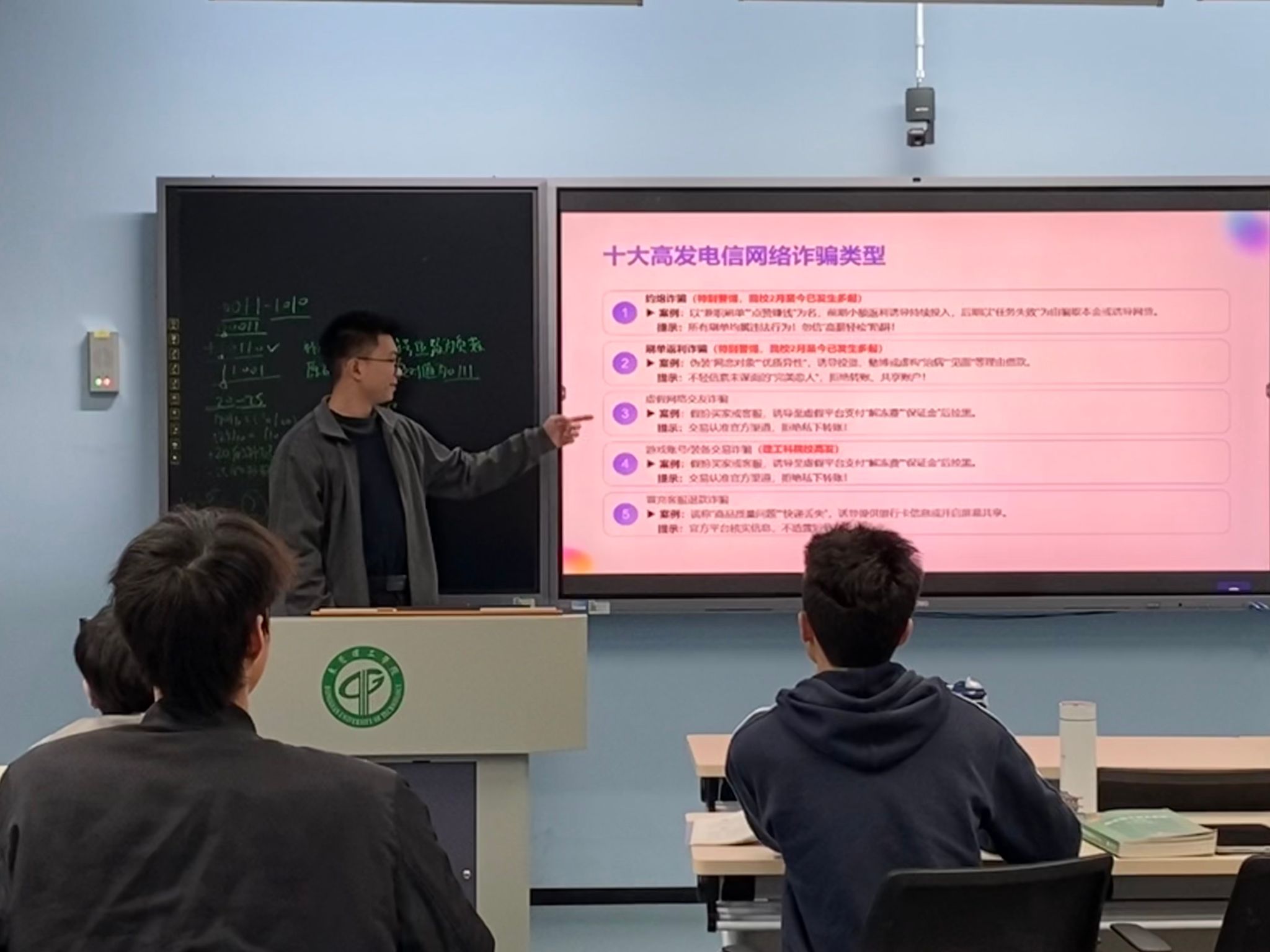 班会伊始,班长聚焦反诈宣传,通过列举网络刷单、游戏账号诈骗等真实案例,深刻剖析了骗子的常用手段,为同学们敲响了警钟。随后,班主任鼓励大家结合专业特色,制定个人发展规划,积极参与科研和实践活动,为未来的职业生涯打下坚实的基础。