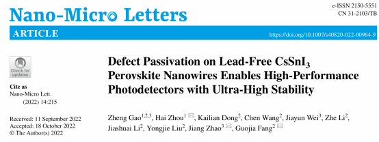 周海特聘教授团队在无铅钙钛矿纳米线器件领域取得新进展,以“Defect Passivation on LeadFree CsSnI3 Perovskite Nanowires Enables HighPerformance Photodetectors with UltraHigh Stability”为题,发表于SCI期刊Nano-Micro Letters,东莞理工学院为第一通信单位。《Nano-Micro Letters》属于中科院一区TOP期刊,影响因子23.655。