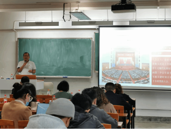 肖凤良副教授以《全面建设社会主义现代化国家的政治宣言和行动纲领》为题,从党的二十大大会主题和党的二十大报告总体结构出发,围绕过去五年的工作和新时代十年的伟大变革、开辟马克思主义中国化时代化新境界的中国式现代化的思想引领、新时代新征程中国共产党的使命任务、全面建设社会主义现代化国家的重大任务这四个方面,对党的二十大的重大意义、精神实质和深刻内涵进行了全面宣讲和深入阐释,并提出学习党的二十大报告的要求。肖凤良副教授的宣讲内容丰富,紧扣实际,既系统全面,又重点突出;既有理论深度,又有实践力度,对全体师生准确把握党的二十大精神有很大帮助。今后全体师生将进一步深入学习贯彻党的二十大精神,努力将党的二十大精神转化为具体行动。