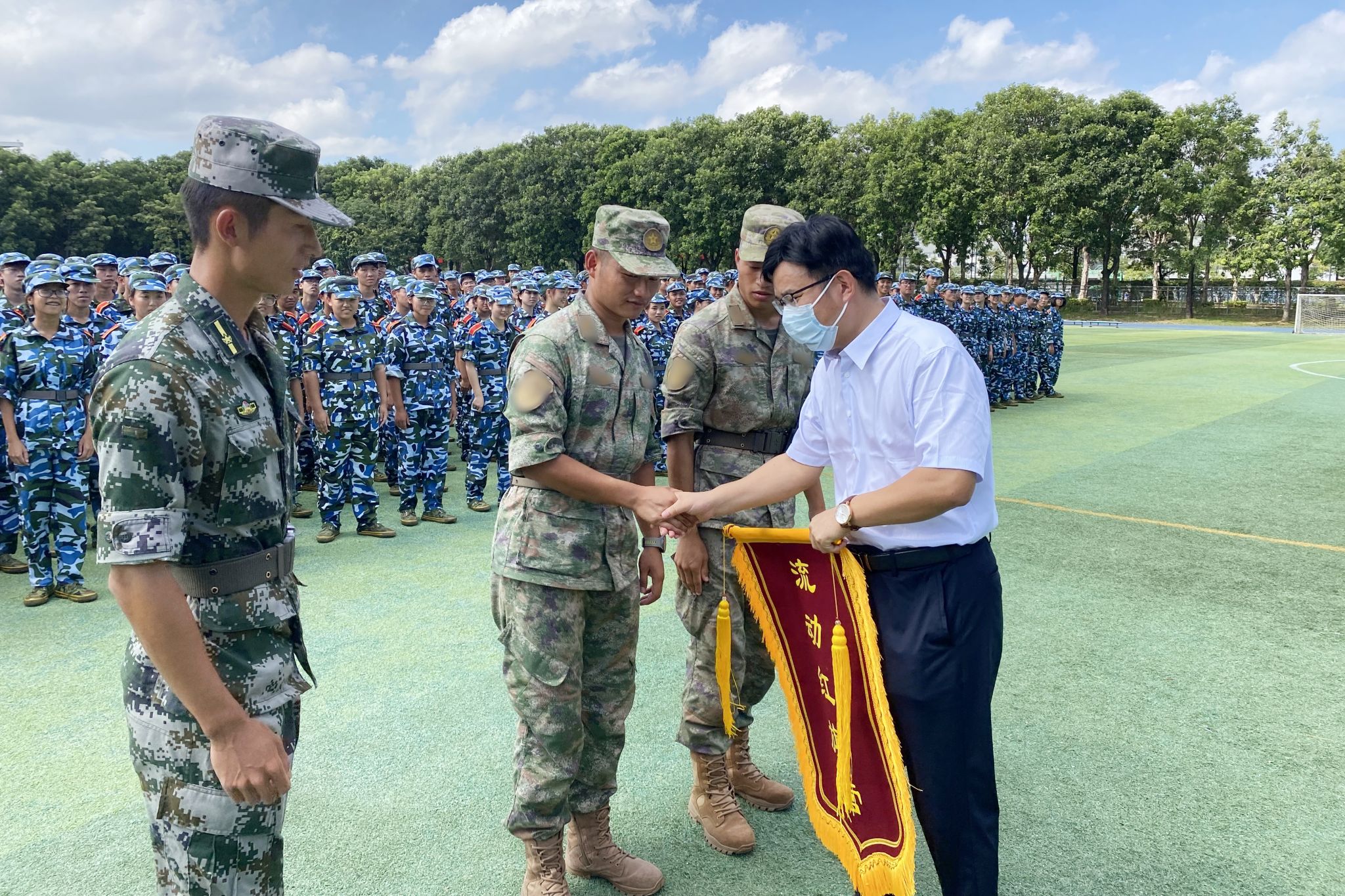 党委书记、执行院长任斌代表学院向军训教官授予“流动红旗营”荣誉锦旗。
