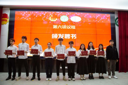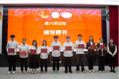 大会第六项议程,由卢楚韵老师和魏锋老师为各部门负责人颁发聘书,勉励各位同学在下一年度的团学工作中再接再厉,持续提升。