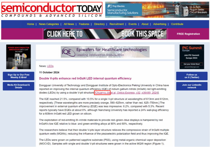 近日,东莞理工学院球天下体育 和北京大学东莞光电研究在Optics Express 发表InGaN红光发光二极管的研究成果被国际知名半导体杂志Semiconductor Today专题报道。文章中报道了采用双V坑结构提高InGaN红色发光二极管(LED)的内部量子效率(IQE)的最新研...